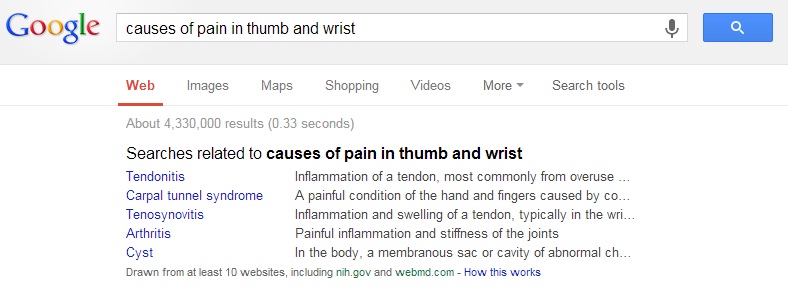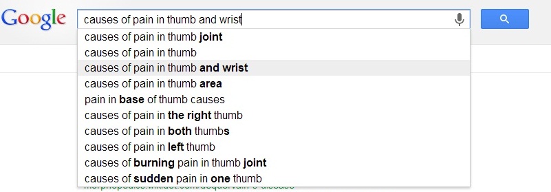 ধরুন আপনার হাতে ব্যথা। প্রথমে নির্ধারণ করুন কোথায় ব্যাথা। দেখা গেল আপনার বুড়ো আঙ্গুলে ব্যাথা। আপনি গুগোলে লিখবেন causes of pain in thumb একটু অপেক্ষা করুন গুগোল আপনাকে সাজেশন দিবে। যেইটা বেশি নির্ভর যোগ্য মনে হয় ক্লিক করুন( ছবি দেখুন)